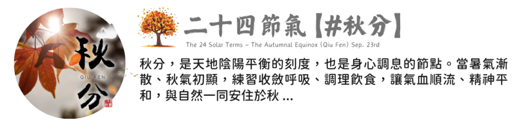 【食聊】二十四節氣【二十四節氣 X 秋分|秋分風起晝夜平,潤燥養陰正當時】 Posted on 2025-09-232025-10-07 by Ling 23 9 月 ????【秋】收斂神氣.使秋氣平 ????♂️ 秋季氣候最大的特點是 「秋燥」。 暑熱未消、秋陽似火,萬物逐 […] Continue reading →