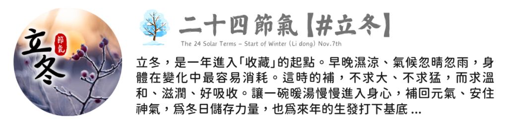【食聊】二十四節氣【二十四節氣 X 立冬|寒氣生百病,暖身宜自調】 Posted on 2025-11-072025-11-10 by Ling 07 11 月 THE 24 SOLAR TERMS The Beginning of Winter 今年立冬,台灣天氣較不穩 […] Continue reading →