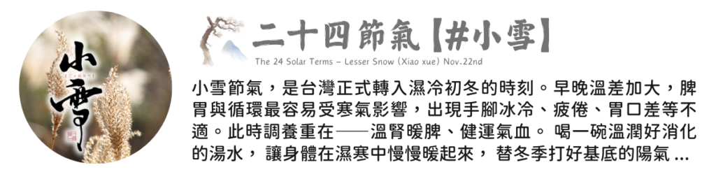 【食聊】二十四節氣【二十四節氣 X 小雪|天涯飛霰撒窗纖,坐久侵衣冷未添】 Posted on 2025-11-222025-11-26 by Ling 22 11 月 入冬後第二個節氣|小雪 天氣濕冷、早晚溫差大,這段時間最容易出現——脾胃弱、手腳冷、氣血循環差。《內經》說:冬 […] Continue reading →