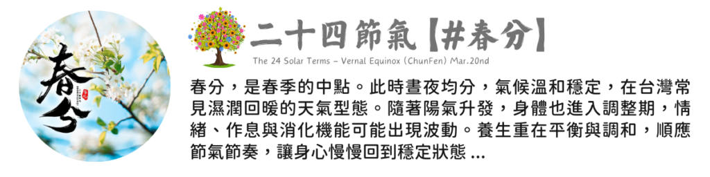 【食聊】二十四節氣【二十四節氣 × 春分|晝夜均分,萬物歸和】 Posted on 2026-03-202026-03-21 by Ling 20 3 月 The 24 Solar Terms ????二十四節氣・春分 ???? #春分 晝夜均分,萬物在此刻,回到 […] Continue reading →